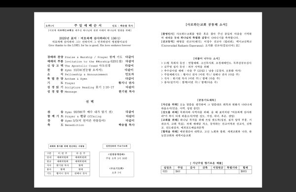 11월 3주 주일예배 주보 페이지 정보 작성자 사모하는교회 댓글 0건 조회 51회 작성일 25-11-15 17:45 목록 본문 2025년 11월 16일 주일예배 주보 이전글11월 5주 (30일) 추수감사주일예배 주보 25.11.29 다음글10월 3주(19일) 주일예배 주보 25.10.17 댓글 0 댓글목록 등록된 댓글이 없습니다. 목록