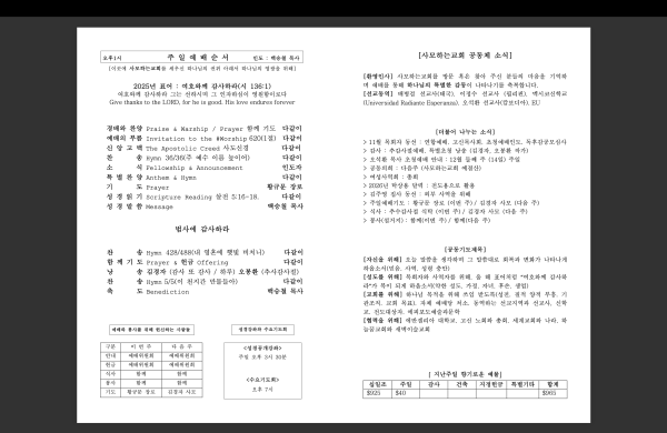 11월 5주 (30일) 추수감사주일예배 주보 페이지 정보 작성자 사모하는교회 댓글 0건 조회 6회 작성일 25-11-29 11:14 목록 본문 2025년 11월 30일 추수감사주일예배 주보 다음글11월 3주 주일예배 주보 25.11.15 댓글 0 댓글목록 등록된 댓글이 없습니다. 목록
