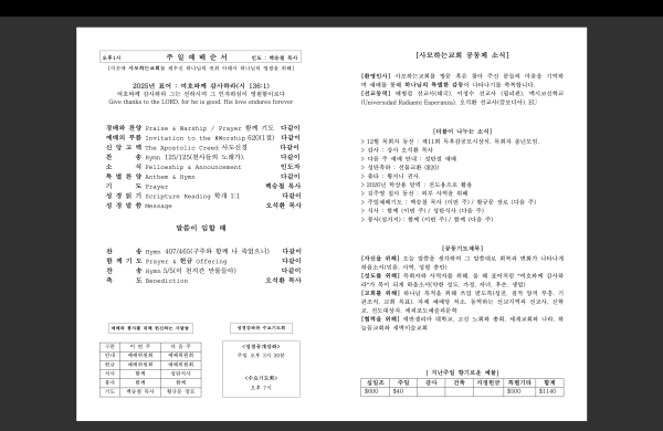 12월 2주 (14일) 주일예배 주보 페이지 정보 작성자 사모하는교회 댓글 0건 조회 143회 작성일 25-12-13 20:47 목록 본문 2025년 12월 14일 주일예배 주보 이전글12월 4주 (28일) 주일예배 주보 25.12.26 다음글12월 1주(7일) 주일에배 주보 25.12.06 댓글 0 댓글목록 등록된 댓글이 없습니다. 목록