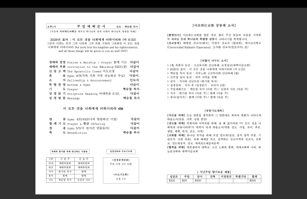 1월 2주 (11일) 주일예배 주보 페이지 정보 작성자 사모하는교회 댓글 0건 조회 1회 작성일 26-01-12 10:06 목록 본문 2026년 11월 11일 주일예배 주보 다음글1월 1주(4일) 주일예배 주보 26.01.02 댓글 0 댓글목록 등록된 댓글이 없습니다. 목록